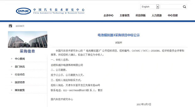 中国汽车技术研究中心2017年3月7日公告,合肥万向娱乐电源系统有限公司中标中国汽车技术研究中心“电池模拟器2”(招标编号:CATARC(TATC)-2015085)、“电池模拟器3”(招标标号:CATARC(TATC)-2015086)项目。