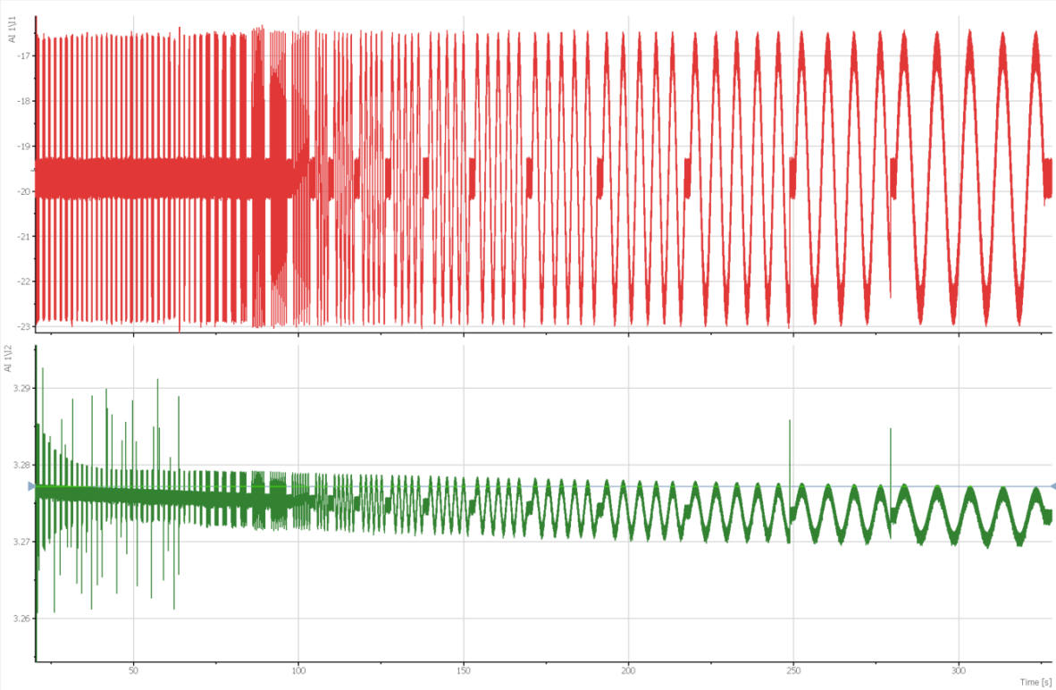 EIS是一种通过向电化学系统施加微幅正弦电压/电流扰动信号,测量其在不同频率(通常10μHz-1MHz)下的电流/电压响应,特别是相位差及幅值比,进而计算复阻抗随频率变化的谱图的技术。其核心在于利用小扰动满足线性响应条件,使系统行为可用频域传递函数表征。EIS计算依赖于采集的电流以及电压数据。比如,对一个锂电池系统,在20A直流运行过程中施加频率10000Hz~0.1Hz,幅值为2A(RMS)的交流电流扰动,过程中采集的电流电压信号如下: