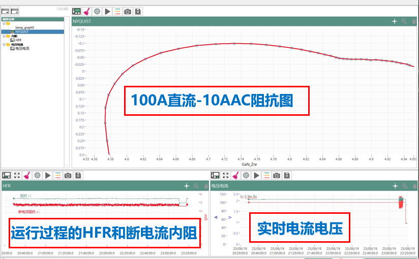 同时,集成后的C100、E500还具备HFR实时监测、断电流内阻实时监测能力,电流电压三角波、方波、线扫等动态工况能力。以有效面积25c㎡ PEM电解水为例,展示其100A运行过程中的断电流内阻监测、HFR监测以及EIS测试结果,以及25A、50A、75A、100A电流下的EIS测试结果。同时对比了新一代燃料电池单池测试台C100-P与前一代产品C100-N及国内外产品标机功能对比表。